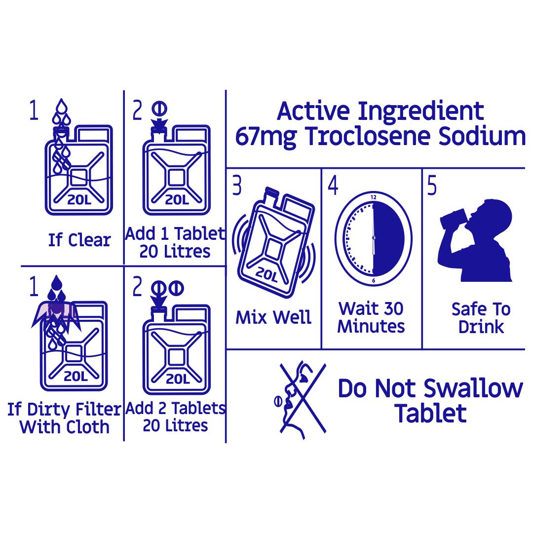 - Large Volume – One 67mg dissolving tablet can purify a container of 20 litres of cold or lukewarm clear water, and two tablets for dirty water.