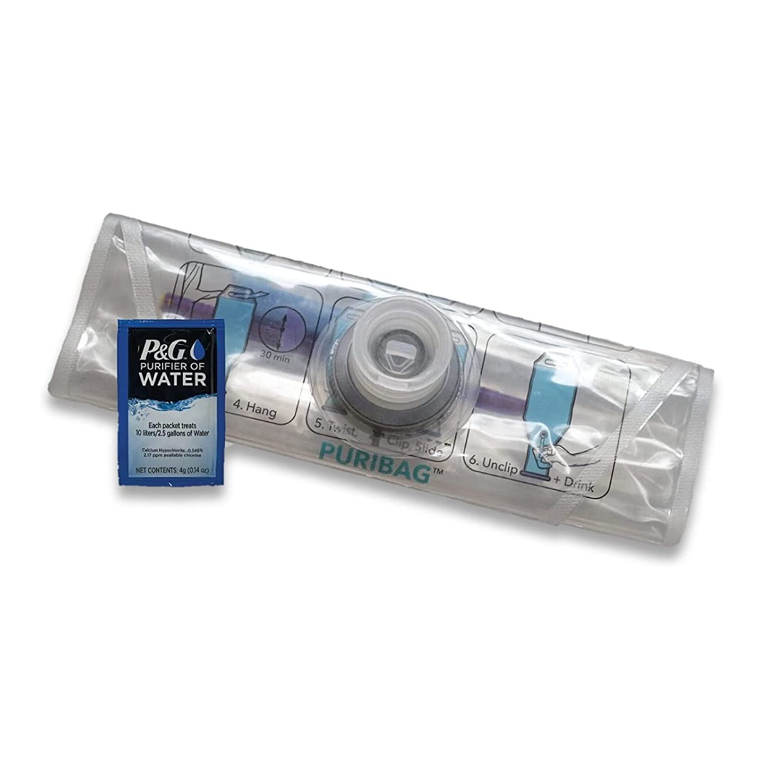 To use, simply fill the pouch with dirty water, add one packet of P&G, and hang/close the bag. Then, using the built in handle, agitate the water for 5 minutes. Next, wait at least 30 minutes for the contaminated debris to sink to the bottom of the bag. Once this is done the water purification will have made the water safe to drink and the Puribag will make it easy to transport that water.